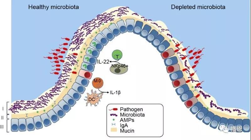 從下圖可以看出,左側(cè)的腸黏膜特點為存在致病微生物(Pathogen,紅色小蝌蚪狀),還存在豐富的益生菌(Microbiota,小螞蟻狀),只有很少的致病微生物進入粘蛋白層(Mucin,黃色部分),而且在粘蛋白層內(nèi)存在豐富的抗菌肽(AMPS,紅色小圓點)和免疫球蛋白A(IgA),此外免疫細(xì)胞T細(xì)胞也已被激活。而右側(cè),益生菌很少,這樣就無法誘導(dǎo)腸黏膜上皮細(xì)胞產(chǎn)生足夠的粘蛋白,薄的粘蛋白層起到的物理屏障就弱。