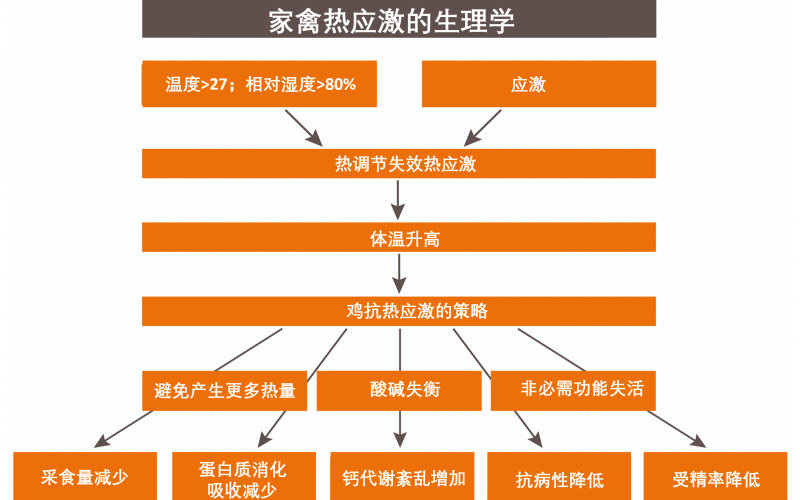 蛋雞產(chǎn)蛋時的最適宜溫度是18~22℃,在該溫度下能夠達到最高的產(chǎn)蛋效率。當溫度達到28℃以上時,蛋雞就開始表現(xiàn)出采食量降低,增加飲水,排出稀糞,產(chǎn)蛋量降低,且蛋體積變小,蛋白變稀,蛋殼變薄,軟殼蛋、破蛋數(shù)量明顯增加;當溫度持續(xù)升高,達到32℃左右時,蛋雞表現(xiàn)出體溫升高,張口喘息,呼吸困難,心跳加速,冠髯發(fā)紺、潮紅,肌肉震顫,易伴發(fā)急性支氣管肺炎,甚至導致死亡。另外,蛋雞發(fā)生熱應激時,由于呼吸緊迫,呈張口喘氣狀態(tài),張開雙翅,嚴重時只能伏臥籠里,無法站立,也有可能導致死亡。一般來講,蛋雞熱應激時,籠養(yǎng)蛋雞最上層,且大多數(shù)是體重較大的蛋雞,往往在午間、扎堆以及應激后發(fā)生死亡。家禽熱應激生理學見圖1,熱應激對蛋雞的危害見圖2。