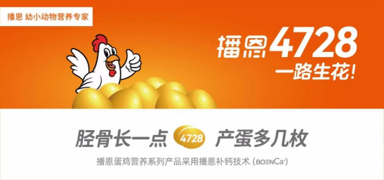 播恩4728,一路生花。為解決蛋雞養(yǎng)殖的營(yíng)養(yǎng)痛點(diǎn),提供更專(zhuān)業(yè)細(xì)致的飼料營(yíng)養(yǎng)呵護(hù),播恩對(duì)產(chǎn)品創(chuàng)新迭代升級(jí),并全新推出4728蛋雞營(yíng)養(yǎng)系列新品。該系列產(chǎn)品均采用播恩補(bǔ)鈣技術(shù),完美解決鈣消化、鈣吸收和鈣沉積三大命題,已申請(qǐng)專(zhuān)利保護(hù)。新品覆蓋了蛋雞育雛、育成、產(chǎn)蛋和淘雞4個(gè)時(shí)期的7個(gè)核心營(yíng)養(yǎng)產(chǎn)品:開(kāi)口料H000、育雛料H041、育成料H042、產(chǎn)蛋料H353/H033,伴產(chǎn)寶、伴殼寶、伴淘寶。具有更強(qiáng)的產(chǎn)品力及競(jìng)爭(zhēng)優(yōu)勢(shì),有效滿(mǎn)足專(zhuān)業(yè)化蛋雞養(yǎng)殖營(yíng)養(yǎng)需求。