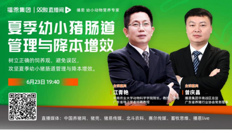 在6月23日晚19:40,40萬(wàn)+養(yǎng)豬網(wǎng)友齊聚播恩雙酸直播間,共同觀看了第三十六期訪談式直播《夏季幼小豬腸道管理與降本增效》,期間中國(guó)養(yǎng)豬網(wǎng)、豬兜、豬易傳媒、北斗農(nóng)科、賽爾傳媒、蓄牧思維、播恩live七大平臺(tái)進(jìn)行同步轉(zhuǎn)播,本期直播邀請(qǐng)了華南農(nóng)業(yè)大學(xué)動(dòng)物科學(xué)學(xué)院院長(zhǎng)/教授/博導(dǎo)/廣東省珠江學(xué)者特聘教授江青艷,播恩集團(tuán)華南戰(zhàn)區(qū)總監(jiān)/廣東省養(yǎng)豬行業(yè)協(xié)會(huì)常務(wù)理事曾慶昌,共同分析探討豬場(chǎng)現(xiàn)象、腸道管理對(duì)幼小豬的影響、幼小豬飼養(yǎng)管理的關(guān)鍵點(diǎn)分析、腸道管理與降本增效四個(gè)方面,在豬價(jià)回暖的當(dāng)下,為豬場(chǎng)做好夏季幼小豬的腸道管理與降本增效提供有利的抓手。