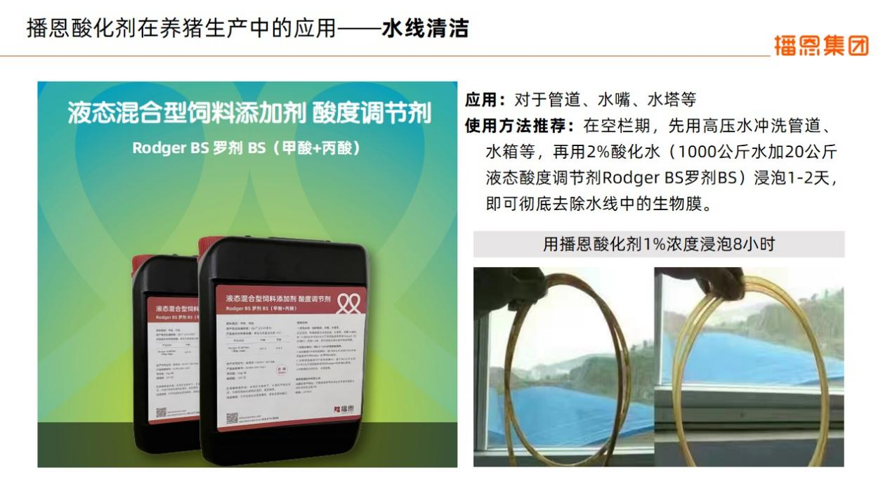 他指出,酸化劑可以降低生豬胃腸道pH值,減少大腸桿菌、沙門氏菌等致病菌的數(shù)量。播恩集團(tuán)液體酸化劑具有豐富的技術(shù)歷史沿革,特點(diǎn)是高效、安全、穩(wěn)定、促健康等。酸化劑主要運(yùn)用在豬場(chǎng)消毒、清潔、動(dòng)物飲水添加等多方面,可有效抑菌、抗病毒,提升豬場(chǎng)生產(chǎn)性能。