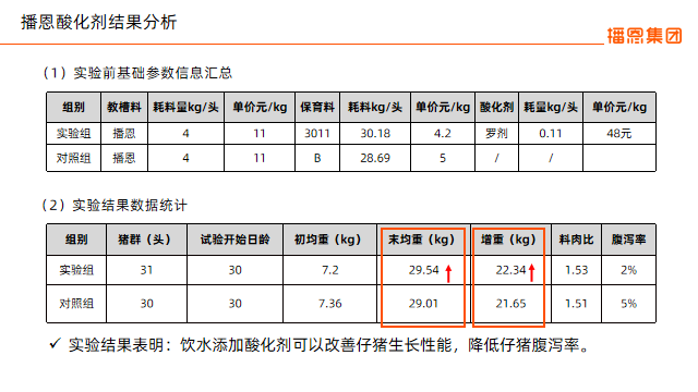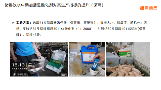 向老師還在現(xiàn)場(chǎng)展示了四組對(duì)比實(shí)證數(shù)據(jù),從保育豬飲水酸化、懷孕母豬飲水酸化兩個(gè)角度印證液體酸化劑的作用。實(shí)驗(yàn)表明,保育豬和懷孕母豬飲水使用播恩雙酸養(yǎng)殖模式酸化劑后,回報(bào)率大大提升。