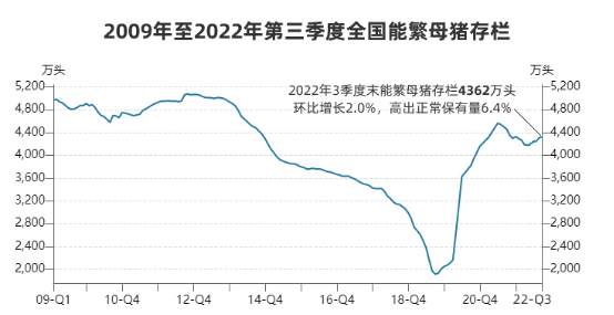 2022年3季度末能繁母豬存欄量環(huán)比增長,高出正常保有量6.4%