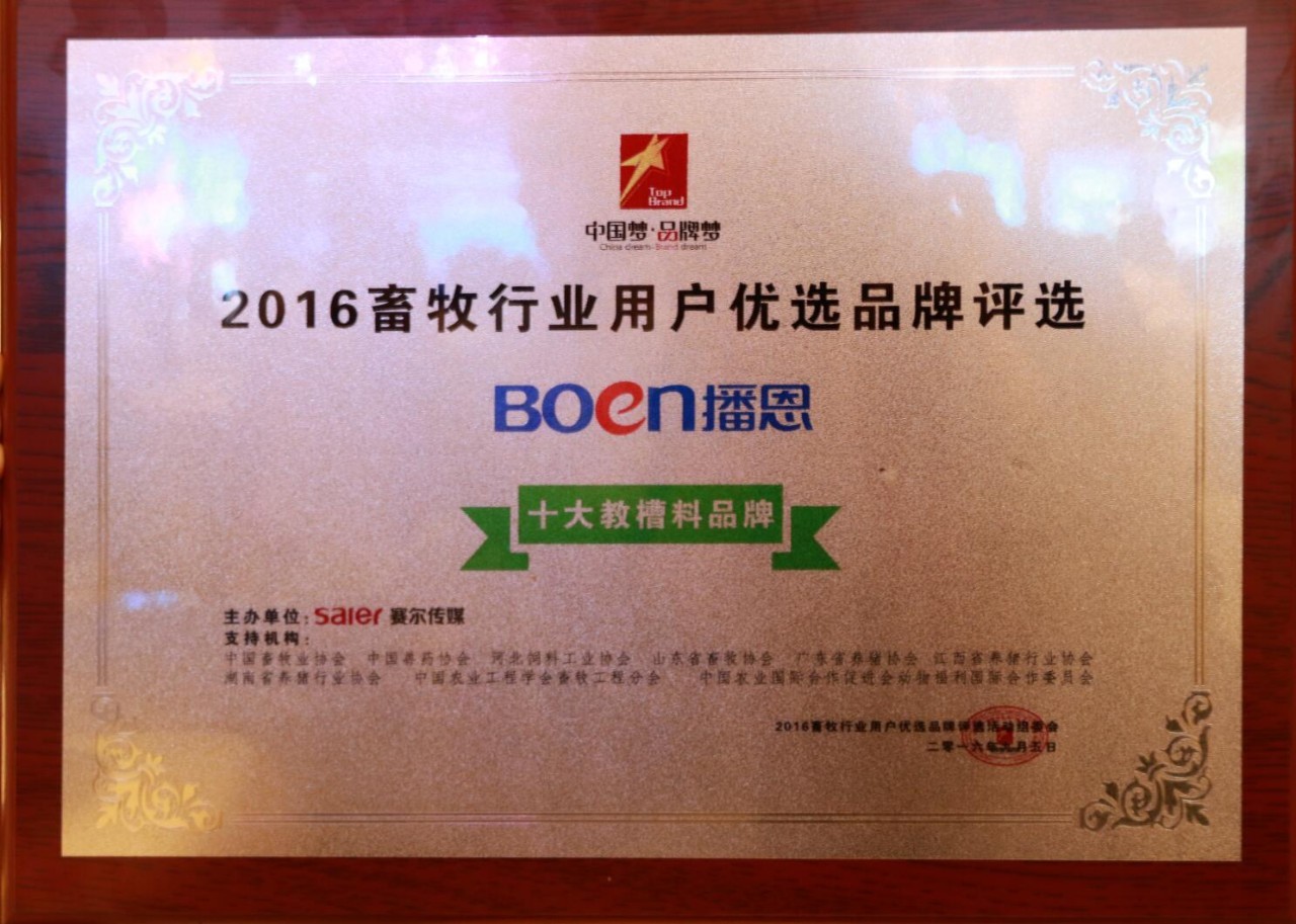 ▲播恩集團(tuán)榮獲十佳教槽料品牌